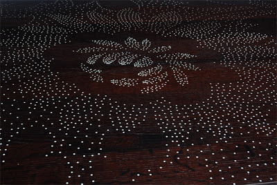 This was a fantastic ICFF find and I look forward to using some of Peter Sandback's work in my future designs. Peter creates dot inlay on tabletops, based off of picotage fabric patterns from the early 20th century that he transposes to paper then follows as a pattern drilling holes and gluing nails into them. Then through careful cutting, sanding and shellacking a designed piece emerges. It is a remarkable process and an even more incredible finished product. Most of these wonderful pieces are coffee or end tables - which would make a perfect conversation piece in any gathering space.